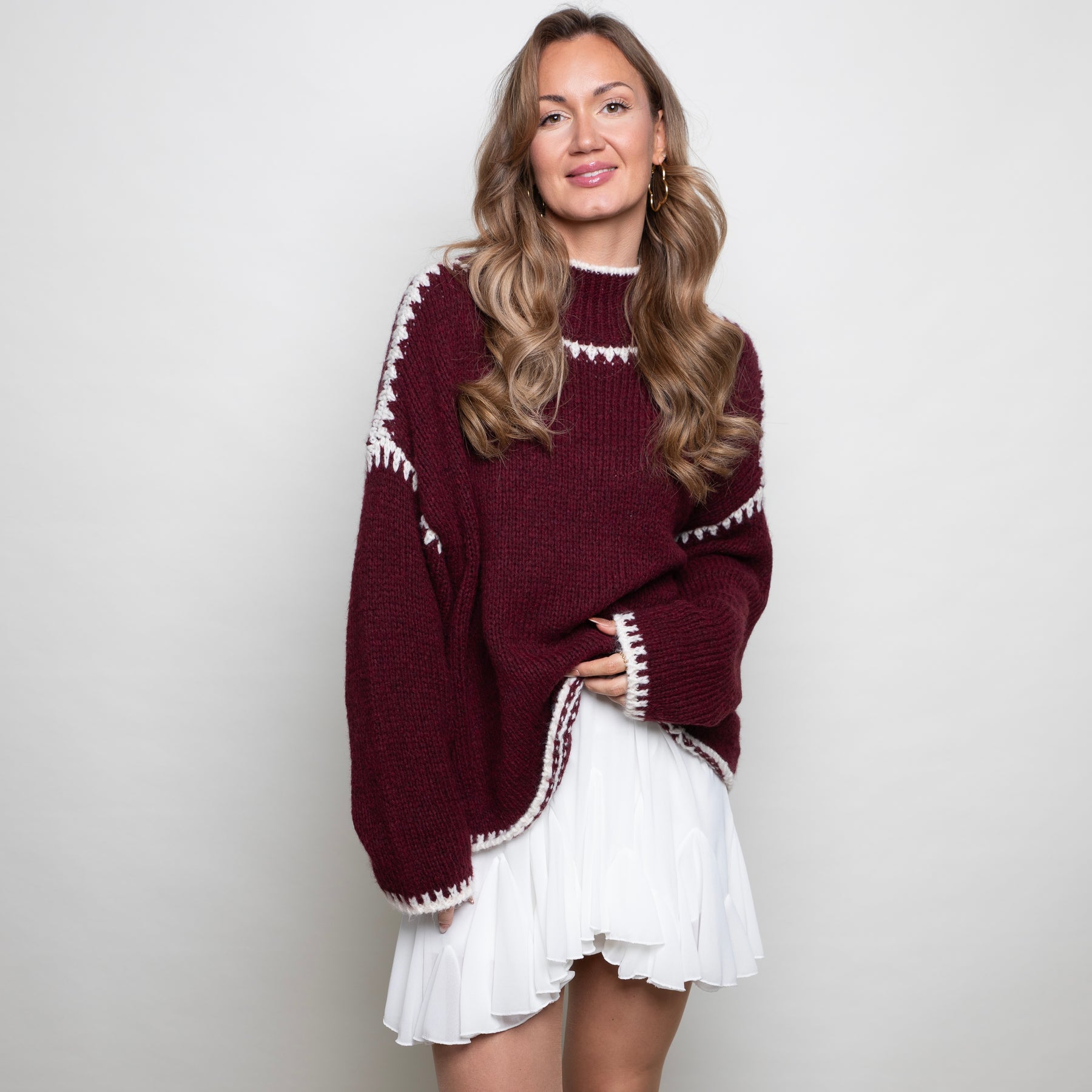Der Berry Charm Oversizepullover kombiniert einen satten Beeren-Ton mit markanten Kontrast-Stitches in Ivory. Die weite, gemütliche Passform, der runde Halsausschnitt und die großzügigen Ärmel sorgen für diesen effortless Cozy-Look, der trotzdem stylisch bleibt – perfekt zu fließenden Röcken, Denim oder Leder.