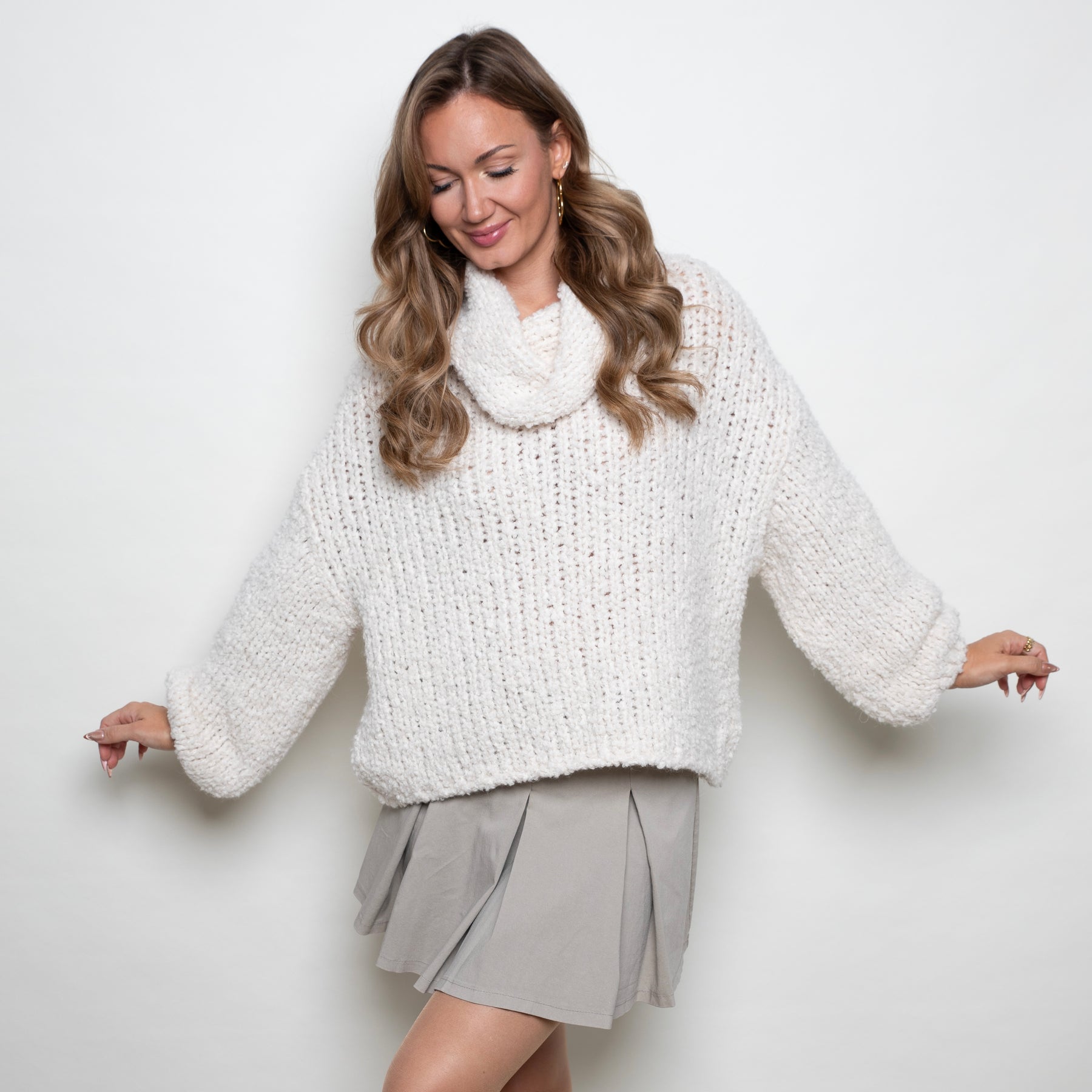 Der Pearl Charm Rollkragenpullover umhüllt dich mit softem Volumen, lockerem Strickbild und einem sanft fallenden Kragen. Überschnittene Schultern und leicht ausgestellte Ärmel sorgen für eine entspannte Silhouette – cozy genug für jeden Tag, edel genug fürs Dinner.