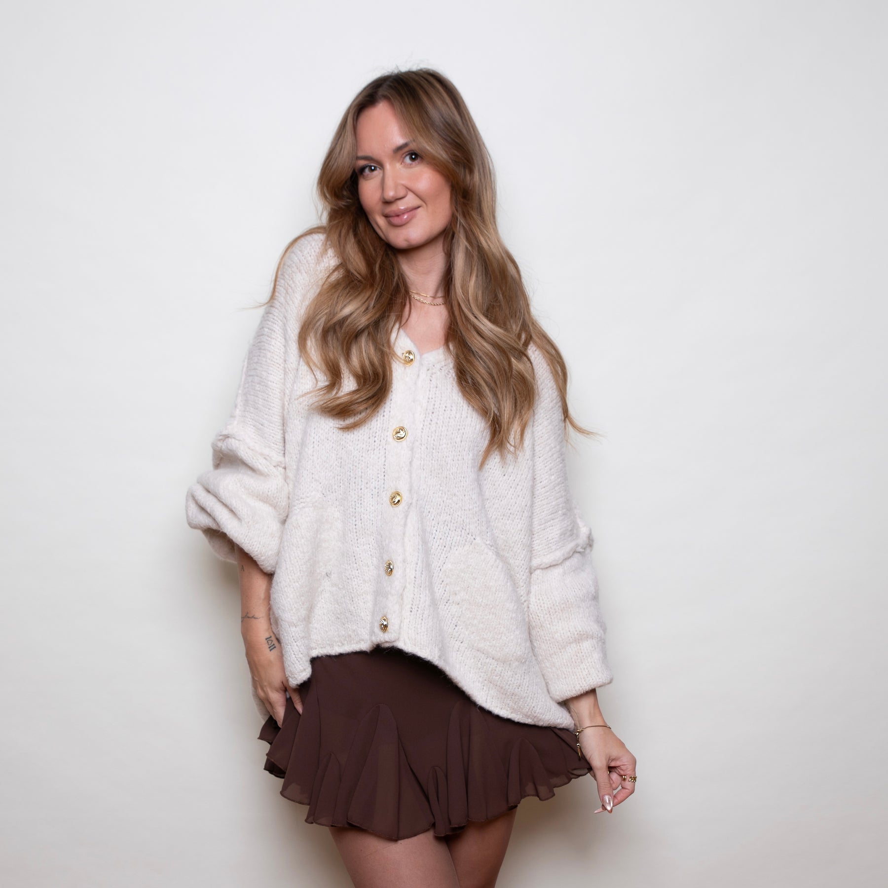 Der Pearl Cloud Strickjacke hüllt dich in softes Volumen, überschnittene Schultern und weit fallende Ärmel. Der cremige Ivory-Ton, goldfarbene Knöpfe und aufgesetzte Taschen verleihen dem Oversize-Fit eine edle Nonchalance – perfekt zum Layern über Dresses, Denim oder feinen Tops.